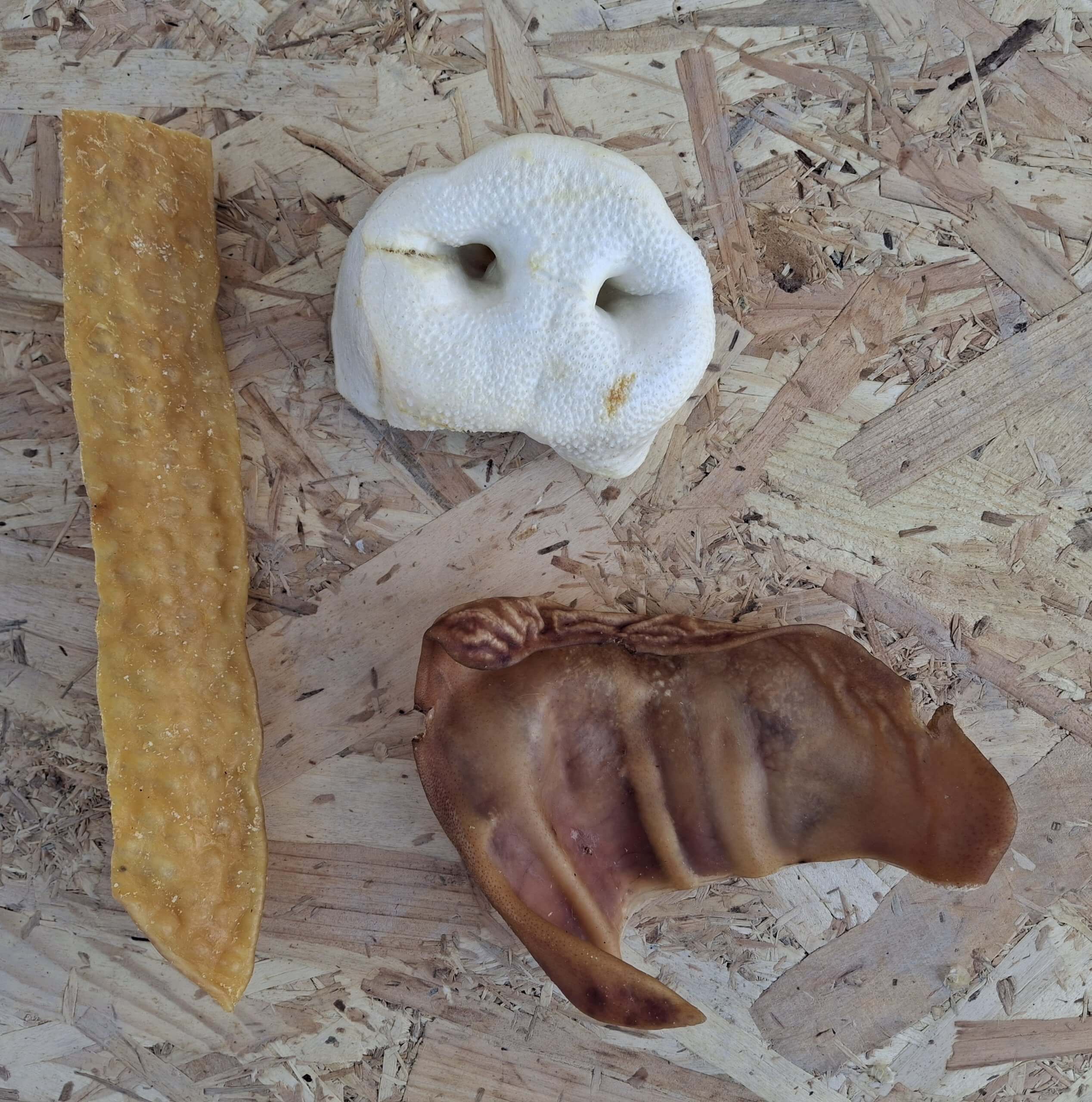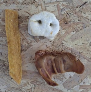 Pattes de poulets, cou de canard, pattes de dinde, peau de porc, nerf de bœuf, oreille de cochon, sabots de veau, peau de buffle, oreille d’agneau, ailes de poulets, os de calcium, corne de moutons…